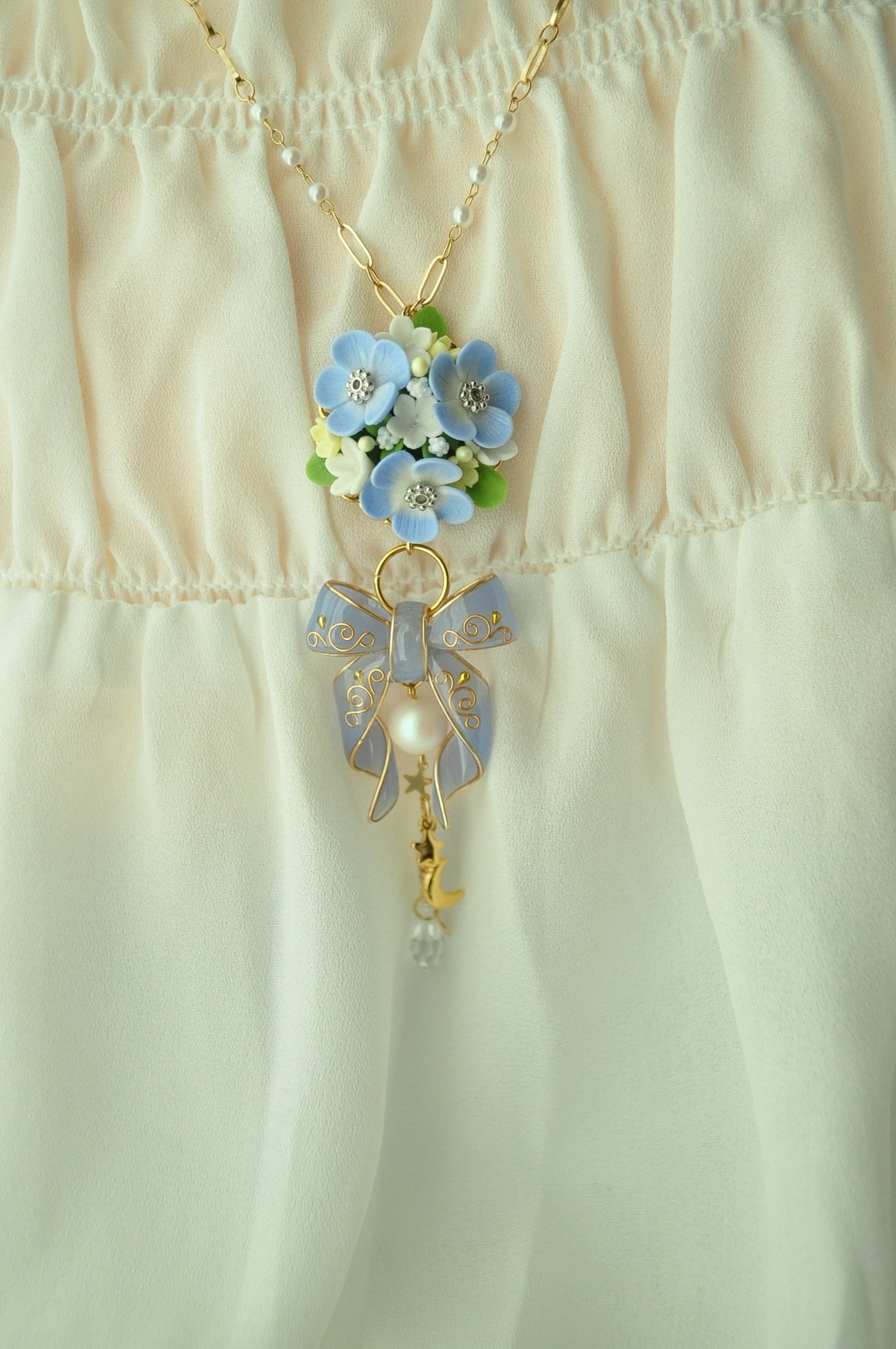 月と星のチャーム、しずく型のビジューが胸元でそっときらめきます。