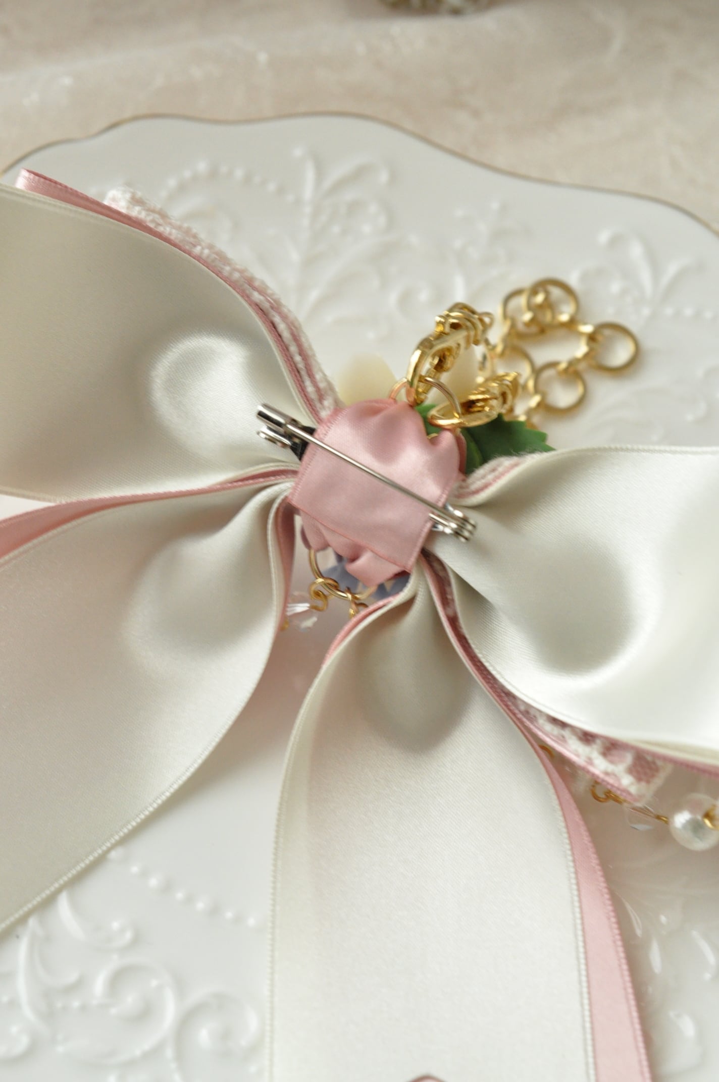 サテンリボンの艶やかな光沢と繊細なレース、揺れるパールチェーンが優美な雰囲気を引き立てます。