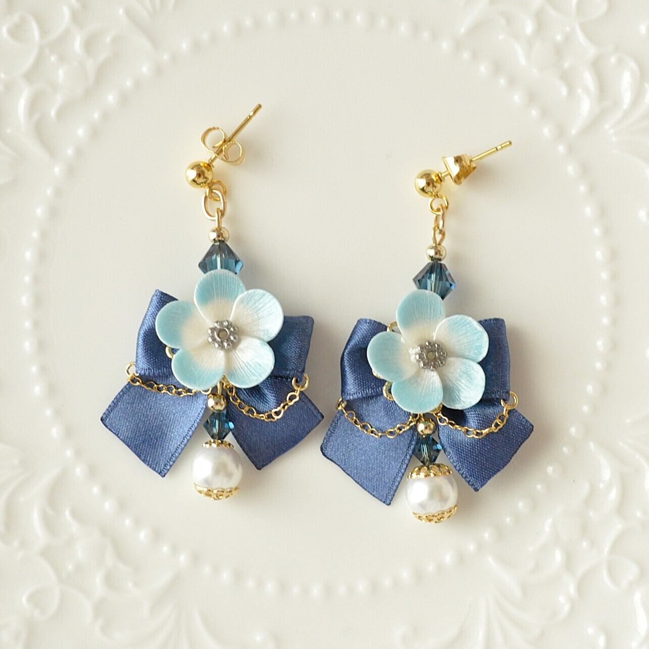 可憐なブルーの花びらが寄り添い、深いネイビーブルーのリボンと共に舞うイヤリング。