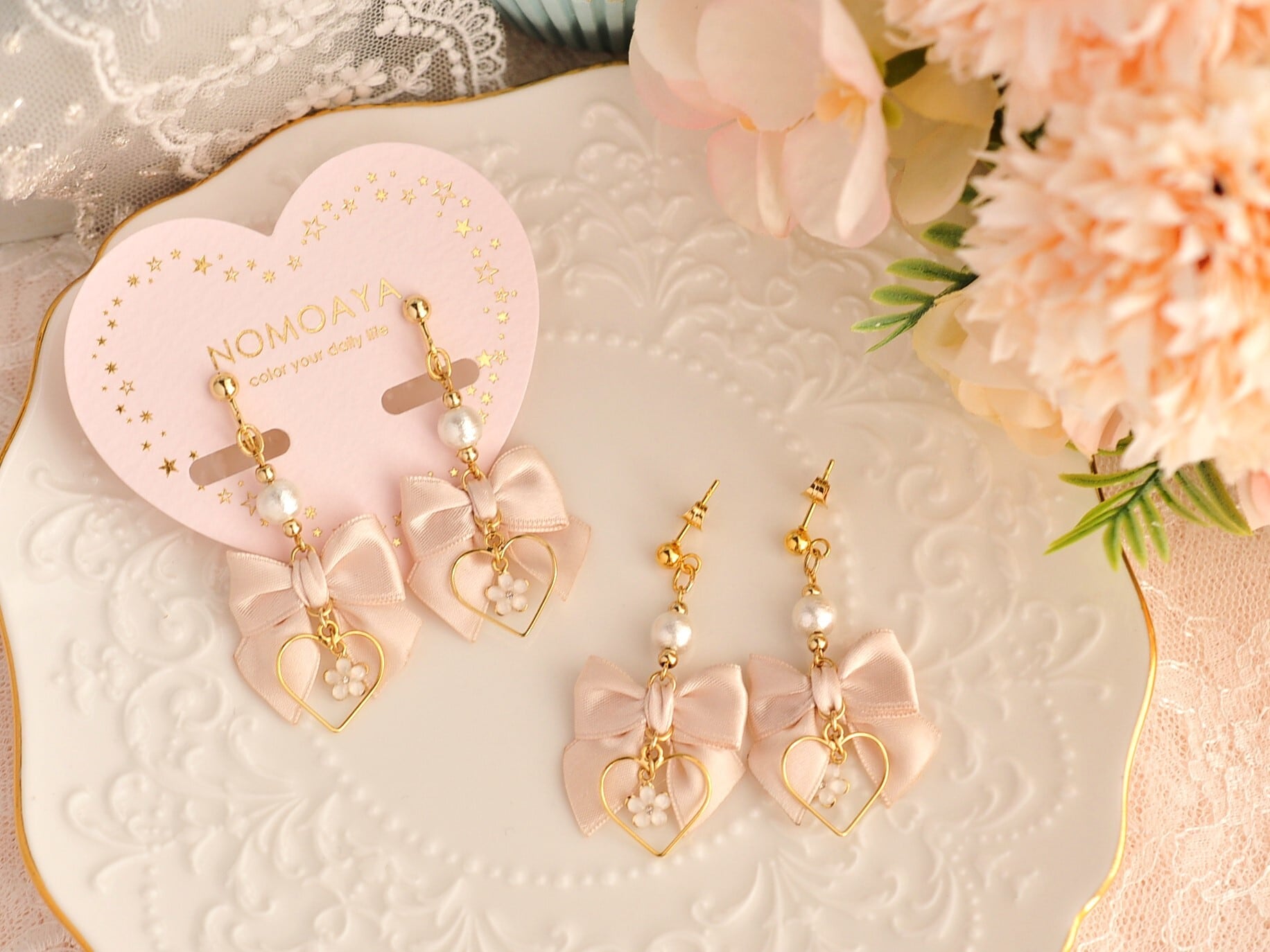 大人の雰囲気漂う淡色カラーの上質なサテンリボンと、細めのワイヤーハートリングや小さなお花のチャームをあしらったデザインのピアスとなっております。